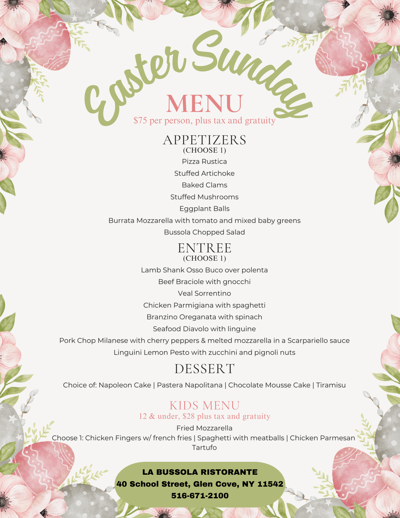 Join us for a truly memorable Easter Sunday dinner at La Bussola Ristorante. Our talented chefs have meticulously crafted a special menu that highlights the best seasonal flavors along with traditional Easter dishes, ensuring a delightful experience for all. Gather your family and friends and join us to experience a wonderful evening filled with exceptional dining and joyful celebration. Please note that reservations are highly recommended to secure your table for this special occasion.